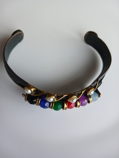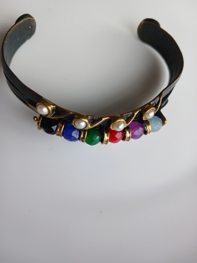Bu bilezik metal alaşımlı gövde üzerine inci ve renkli fasetli boncuklarla tasarlanmış. Boncuklar arasında altın tonlu ayırıcılar kullanılmış, bu da ürüne hem şık hem de zarif bir görünüm kazandırıyor. Sağlam, dayanıklı, iyi işçilik.