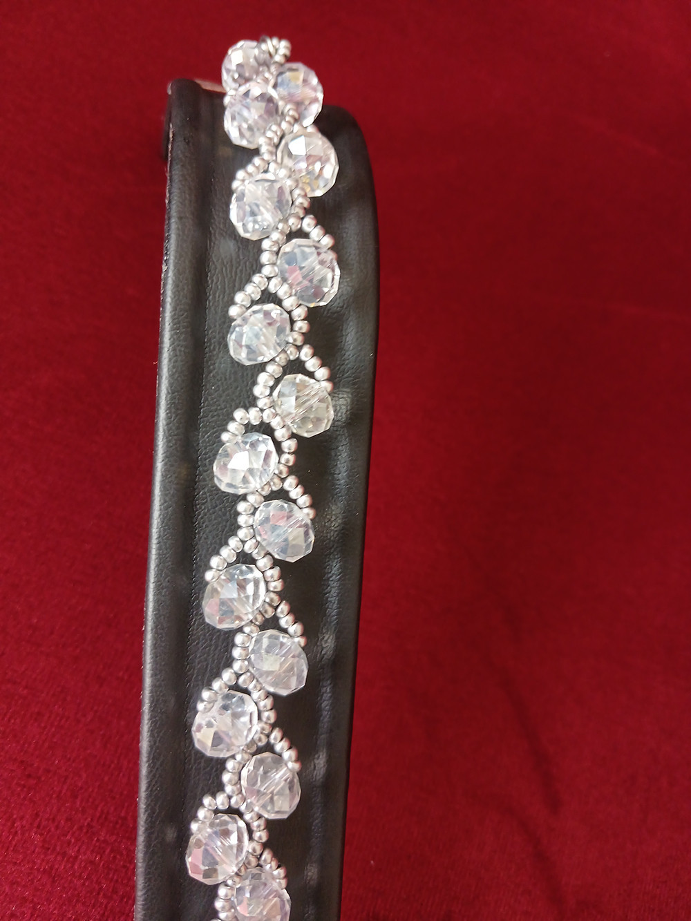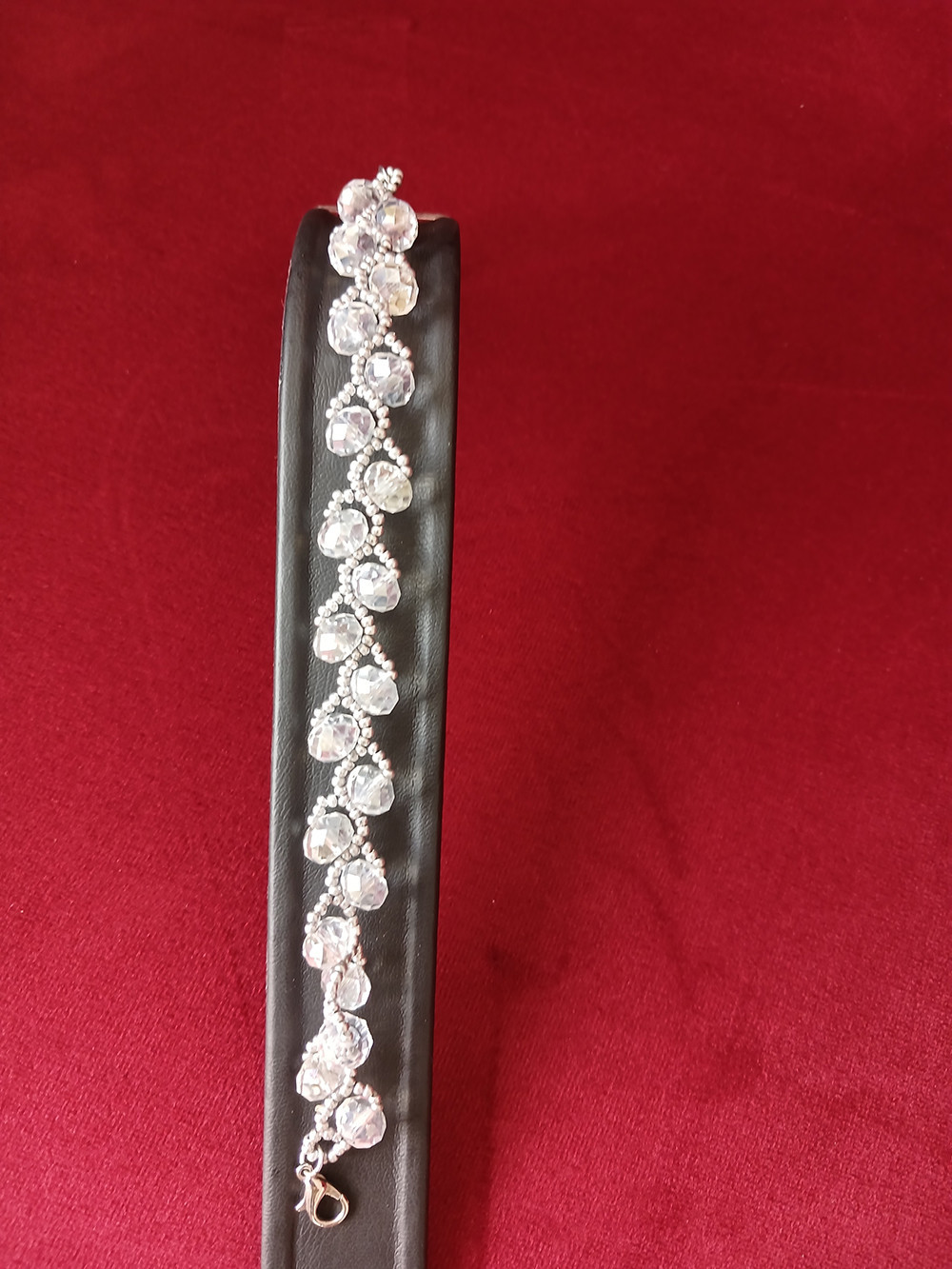 Şeffaf Kristal Cam Boncuktan yapılmıştır. Aralarda kullanılan gümüş renk hematit taş boncuklar tasarıma denge katar. Kolyesi de mevcuttur.