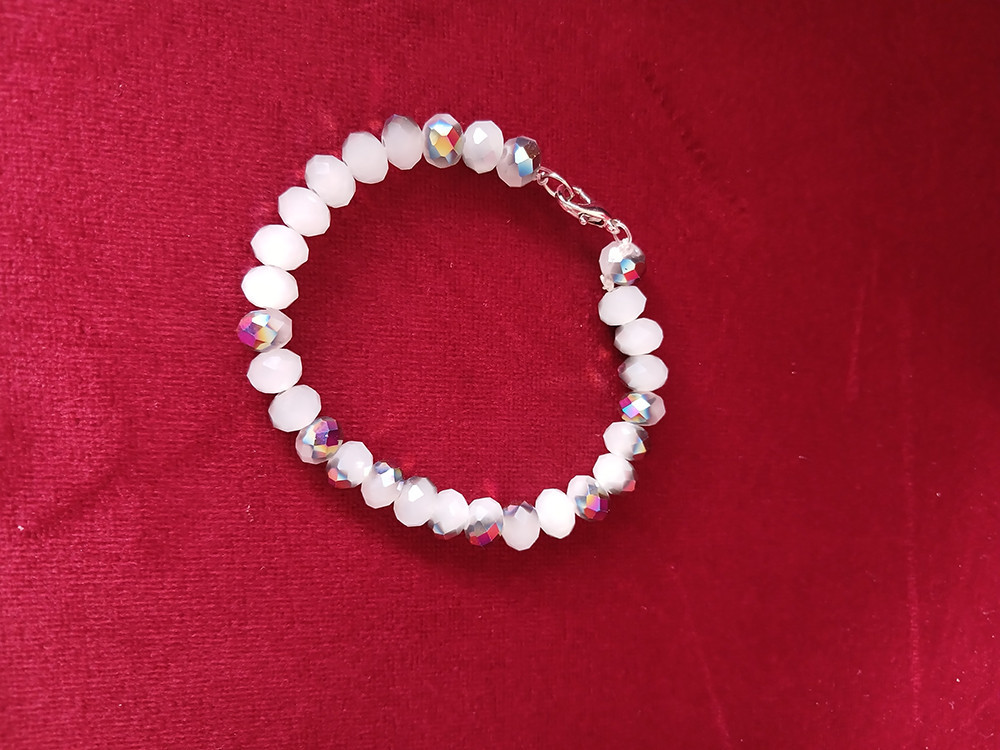 Süt beyazı / opal beyazı (yarı saydam) bir arada kullanılmıştır. Kristal cam boncuktur.