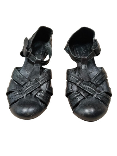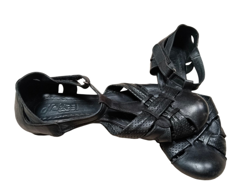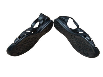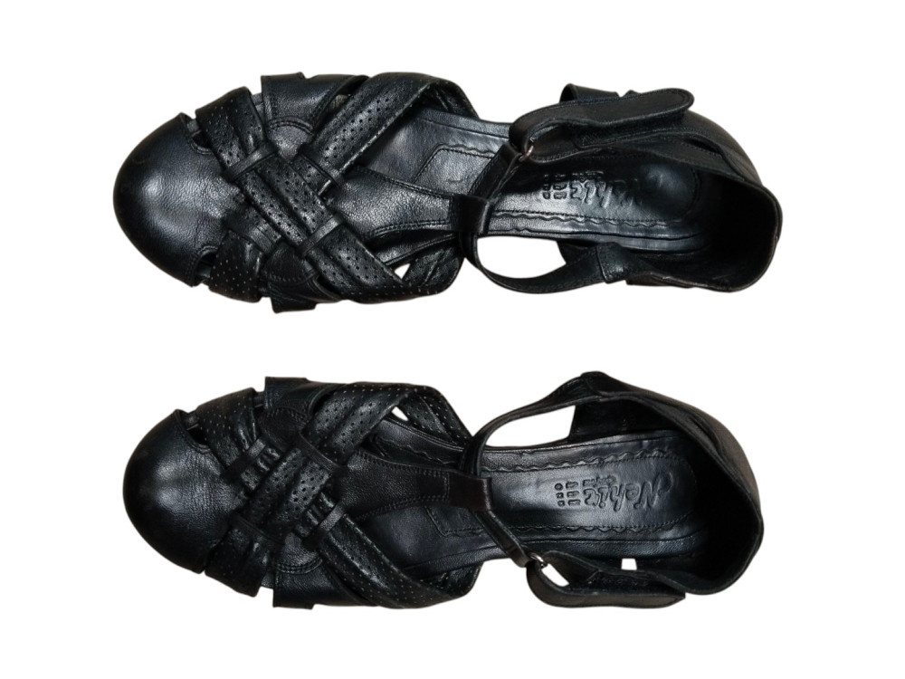 Siyah renkli, önü çapraz örgü formunda, gerçek deriden ayakkabıdır. Kullanılmış, ikinci el üründür. Herhangi bir yırtık, deformasyon v,s yoktur, Sağlam ve rahat, hava alabilen yazlık ayakkabıdır. 38 numaradır. Taraklı ayak yapısına uygun değildir.