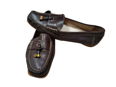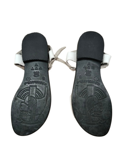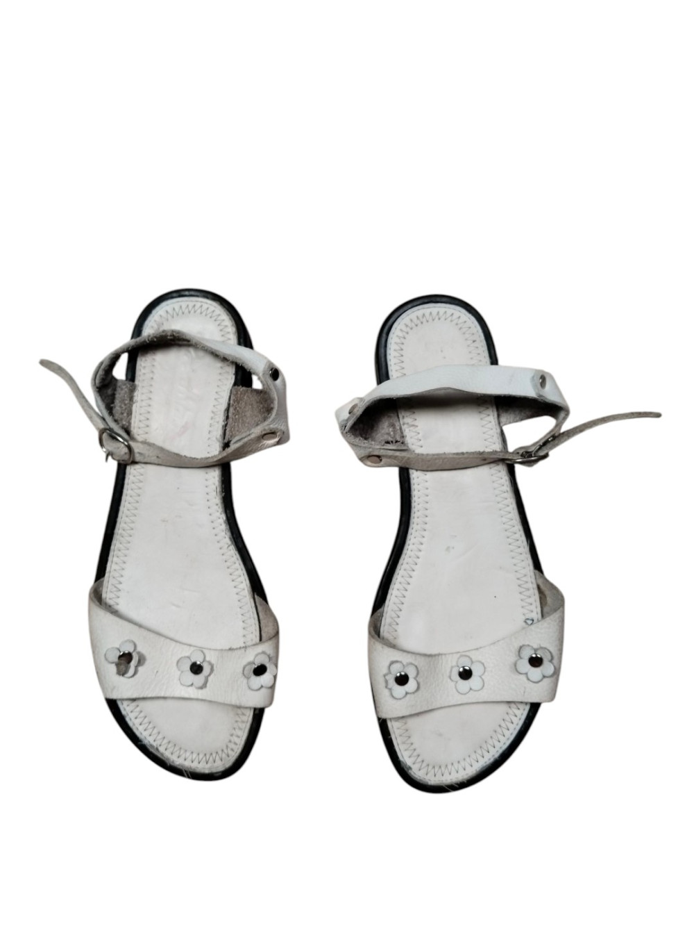 Hakiki deri, önü çiçek formlu, beyaz renkli, düz taban yazlık ayakkabıdır. Kullanılmıştır. İkinci el olmasına rağmen oldukça temiz, deformesi olmayan ve sağlam bir üründür. Taraklı ayak yapısına uygun değildir.