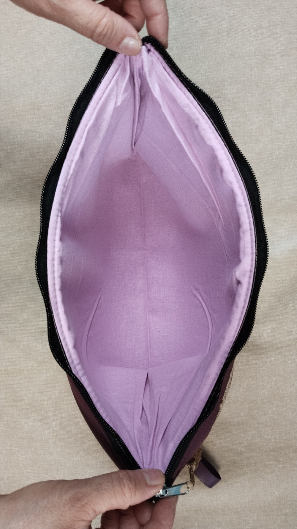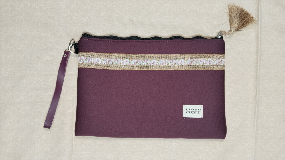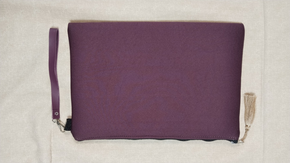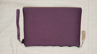 El yapımı butik üründür. Fermuarlıdır. Sentetik kumaştan yapılmış, dikiş kalitesi yüksektir. Hafif, yumuşak dolguludur. Özellikle tablet çantası olarak veya kişisel eşyalar için kullanılabilir. orta boydur. Mürdüm renklidir. En 25 cm, boy 35 cm. Yatay formdadır.