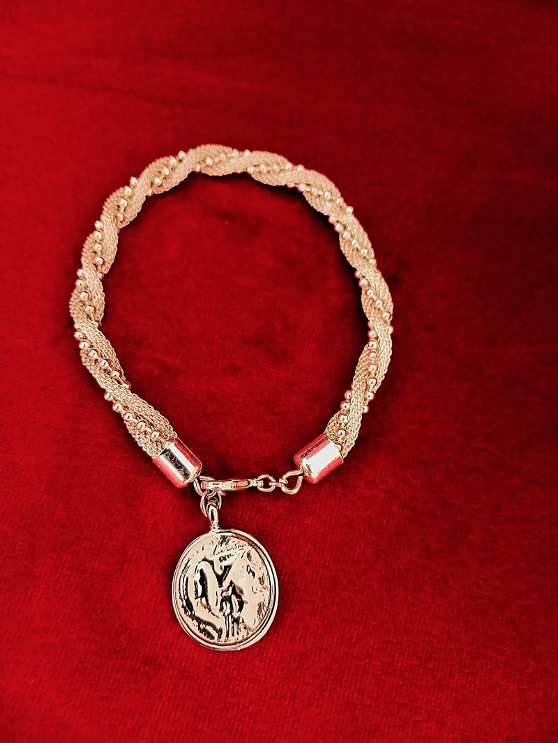 iki farklı tasarımın girift yapısıyla birleşmiş madlyonlu sarmal gümüşi bileklik